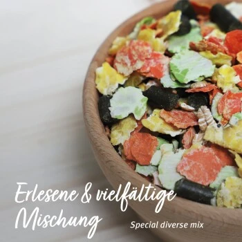 - Vielfältige Mischung aus Gemüseflocken, Getreide, Luzernen und Kräutern