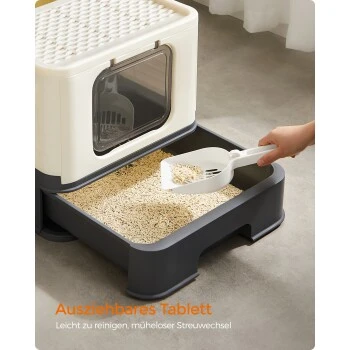 - – Kein Auslaufen: Ein verlängerter Rand oberhalb der Box und ein geschlossener Boden darunter verhindern, dass Streu oder Urin auf den Boden gelangen.