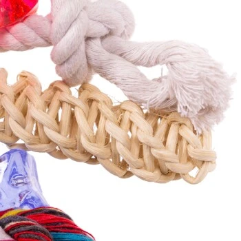 Drei bunte Baumwollknoten, zwei bunte Mineralsteine in Herz- und Sternform sowie ein Kauknochen aus Rinderhaut und eine Glocke bieten Ihrem Vogel genügend Abwechslung beim Spielen.