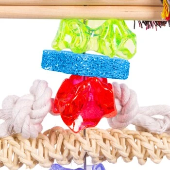Drei bunte Baumwollknoten, zwei bunte Mineralsteine in Herz- und Sternform sowie ein Kauknochen aus Rinderhaut und eine Glocke bieten Ihrem Vogel genügend Abwechslung beim Spielen. Drei bunte Acryl-Kristalle bringen das Spielzeug zum funkeln. Die Holzstangen regen die Knabberlust an. Das ideale Spielzeug für knabberaktive Kakadus und Amazonen aber auch (nach etwas Eingewöhnung) für Graupapageien.