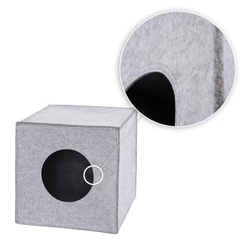 Wenn du an einer Alternative für die gängigen Katzenbetten interessiert bist, ist die lionto Katzenhöhle eine ideale Lösung. Die würfelförmige Kuschelhöhle aus warmem und stabilem Filz beinhaltet einen Eingang mit einem Durchmesser von 17 cm und einer Wanddicke von 5 mm. So kann der faltbare Katzenwürfel ohne Bedenken als Katzenbettchen und Rückzugsort genutzt werden und vermittelt deiner Katze ein sicheres Gefühl und Wohlbehagen. Die Maße betragen 33x37x33 cm und somit ist diese Filzhöhle für einige gängige Regale wie beispielsweise dem Ikea Kallax oder Ikea Expedit Regal geeignet. Wenn du die Höhle in ein passendes Regal stellst, werden besonders Katzen, die sich gerne zurückziehen, voll auf ihre Kosten kommen. Natürlich macht die Katzenhöhle auch freistehend etwas her und bietet immer einen gemütlichen Schlafplatz. Wir bieten diesen Filzwürfel in den Farben hellgrau und dunkelgrau und wahlweise mit einem weichen Liegekissen oder ohne Kissen an. Der Bezug des Liegekissens kann zur Reinigung abgenommen werden.